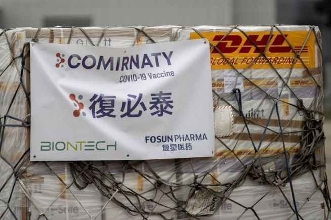 FILE PHOTO: Fosun-BioNTech COVID-19 vaccines are transported to a warehouse after being unloaded from a Cathay Pacific cargo plane at Hong Kong International Airport, in Hong Kong, China February 27, 2021. Jerome Favre/Pool via REUTERS